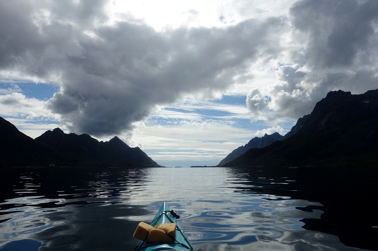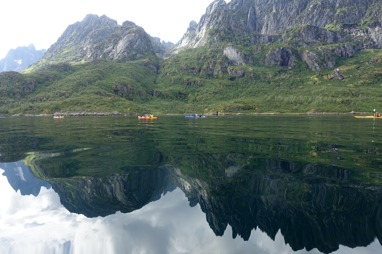 Под этим солнцем мы сделали небольшой крюк, чтобы сфотографироваться на фоне Трольфьорда. Байдарки для него конечно маленькие и не передают все его узость, но зато вполне подчеркивают его величие.